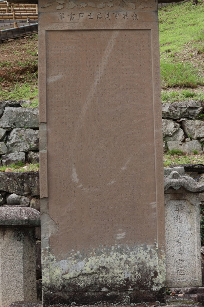 余、嘗て日州の求めに応じて居士の碑銘を作る。其の雄偉の盛んなる、世に顕著なりと雖ども、猶お其の智名勇功を不朽に伝えんと欲する也。今復た信州の請に依りて、石表詞を作るは、亦た昔唐韓愈の太原王公墓に誌して又た神道碑文をも作りし、宋蘇軾の司馬温公の行状を書して又た碑銘をも製せしに庶幾し。余、素より其の万一にも及ばず。然るに居士の名や、涯り無し。而して吾が筆や、涯り有り。有涯の筆を以て、無涯の名を記さんと欲す。韓・蘇、奈何ともする無しと雖ども、今刻む所の石堅くして磷がず、以て涯り無かるべし。遂に之に系くるに辞を以てす。辞に曰く、
