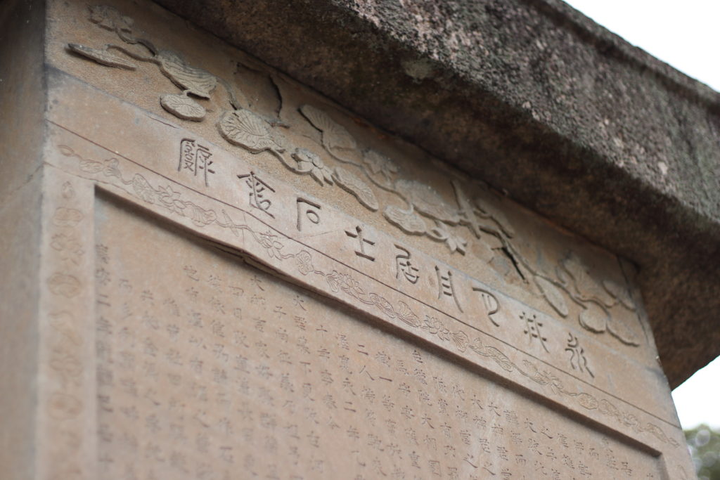 *石表辞 石表は、石標。文字を刻んだ石。辞は、中国の古典文学の一ジャンル。韻はふむが規則はきわめてゆるい。韻文は、末尾3行に刻まれている、「惟昔社殿」から始まり「有武備」でおわる部分。その前の文章は、この韻文たる「辞」を導く序文に当たる。補足も参照のこと。