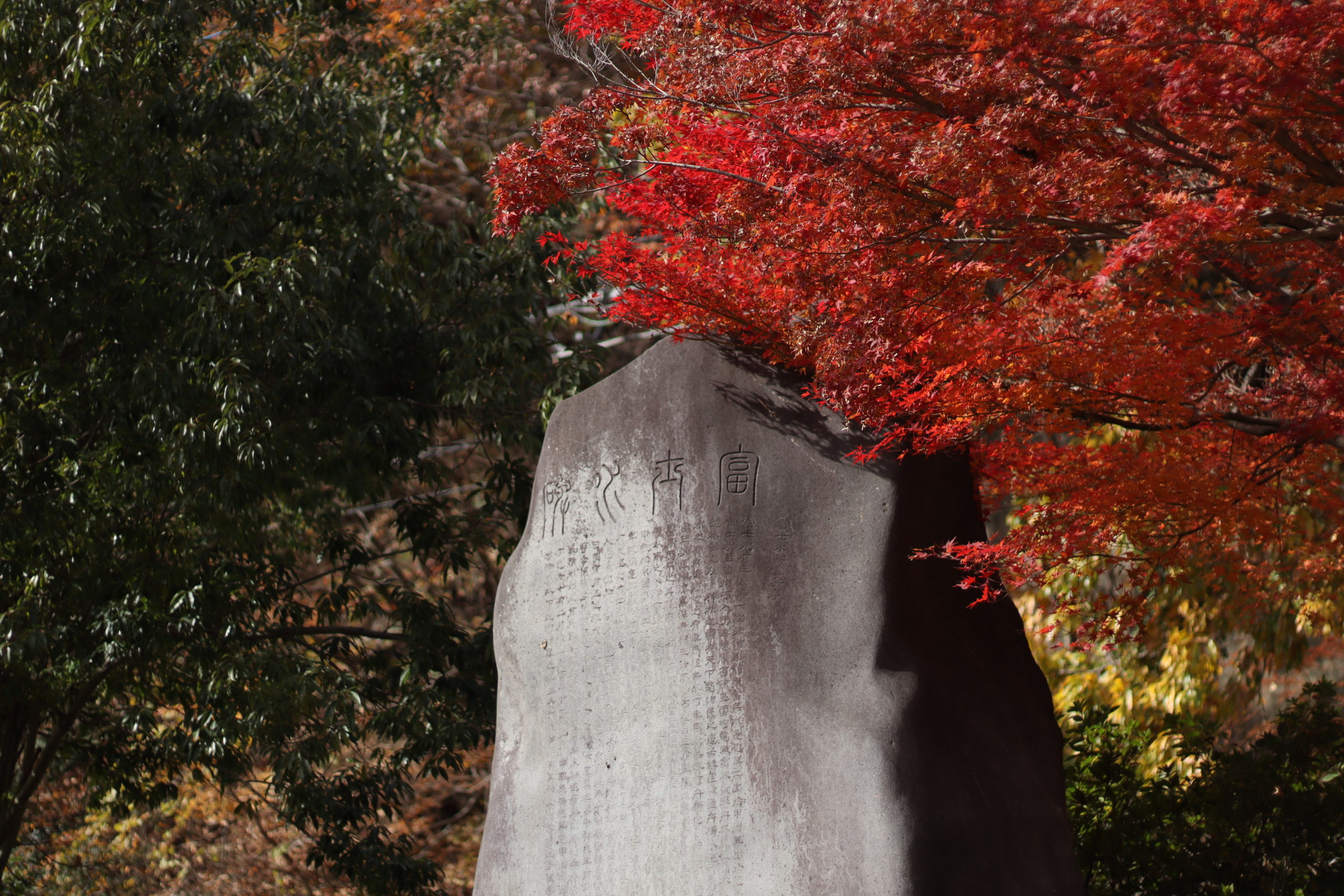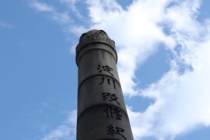 江戸初期、信濃を源流とし甲斐から駿河へ流れるかわに、角倉すみのくらりょうが舟運を開いたのを顕彰する碑。覇者徳川家康の採用で河川事業に長けた了以が富士川を疎通し、慶長12年(1607)舟が上下往来できるようになった。舟の下りは一日と要せず、かつての人力・牛馬に比べ労力は著しく軽減された。甲斐・信濃へは塩や魚が、駿河へは木材がより流通し、加えて川沿いの住人が舟運業で渡世できるようにもなった。了以の功績と恩恵を甲信駿の民たちに忘れさせまいと、疎通から約二百年後、甲斐かじかざわの村役人の発意により同地に建立。鰍沢には河岸かし(川湊)があり、三国の物資と人民が輻輳ふくそうしていた。昭和初年の鉄道(現身延みのぶ線)開通で舟運も役目を終え、今や自動車の往来する国道沿いの河岸跡に、ずしりと立つ。舟運で豊かになった住人達の過去回顧の記念碑であり、かつての富士川舟運繁栄の跡が知られる遺物でもある。