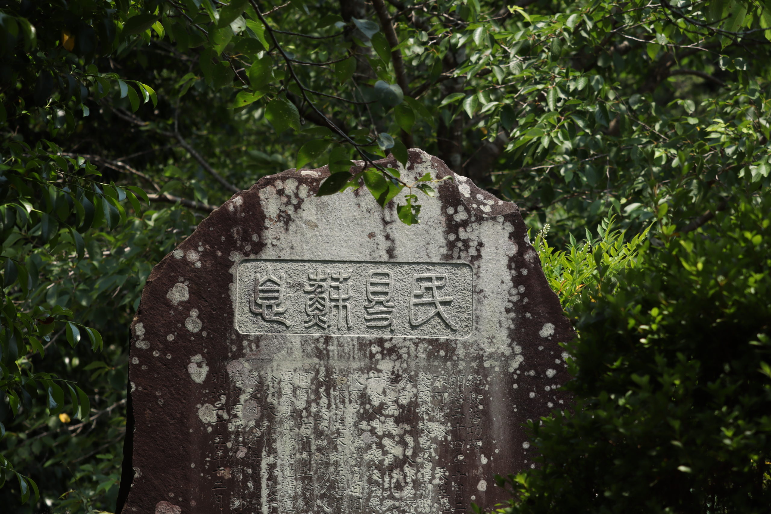明治24年(1891)に岐阜・愛知方面を襲ったのう地震の碑。岐阜県可児かにはるさと村(現可児市)の神社に立つ。地震直後のすさまじさを始めとして、家屋倒壊による村人の犠牲や、水不足など事後の困窮を具体的に記し、読む者に大震災の苦悩を印象付ける。天皇・国・県の救済、国内外からの義捐金、諸人の労苦によって復興し得たといい、これら災害救済の顛末を永遠に伝えようと村人の発意で1年後に建碑。わずか1年の間に、大地の激震と身の上の大転変を経験し、記録として石に残さずにはいられなかったものと見られる。